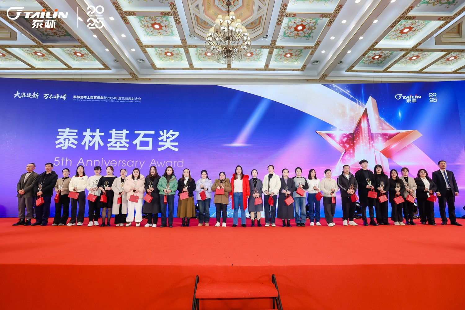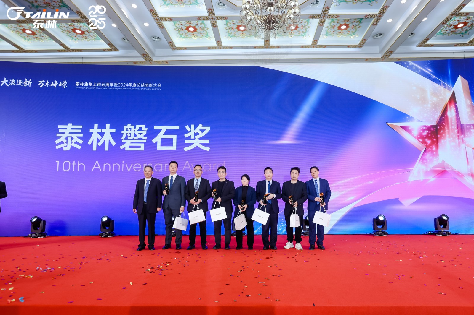 1月14日,“大浪逐新 萬木崢嶸”——泰林生物上市五周年暨2024年度總結(jié)表彰大會在一片熱烈而莊重的氛圍中拉開帷幕。浙江泰林生物技術股份有限公司董事長葉大林先生,浙江泰林生物技術股份有限公司副總裁沈志林先生、夏信群先生,浙江泰林生物技術股份有限公司董事倪崖先生、楊忠智先生共同出席盛典。泰林水生態(tài)領域合作伙伴江蘇宏眾百德生物科技有限公司總經(jīng)理孫蓓麗博士一行受邀到場。老友重聚,新友相逢,舉杯暢飲,共同回顧2024泰林奮進之路!